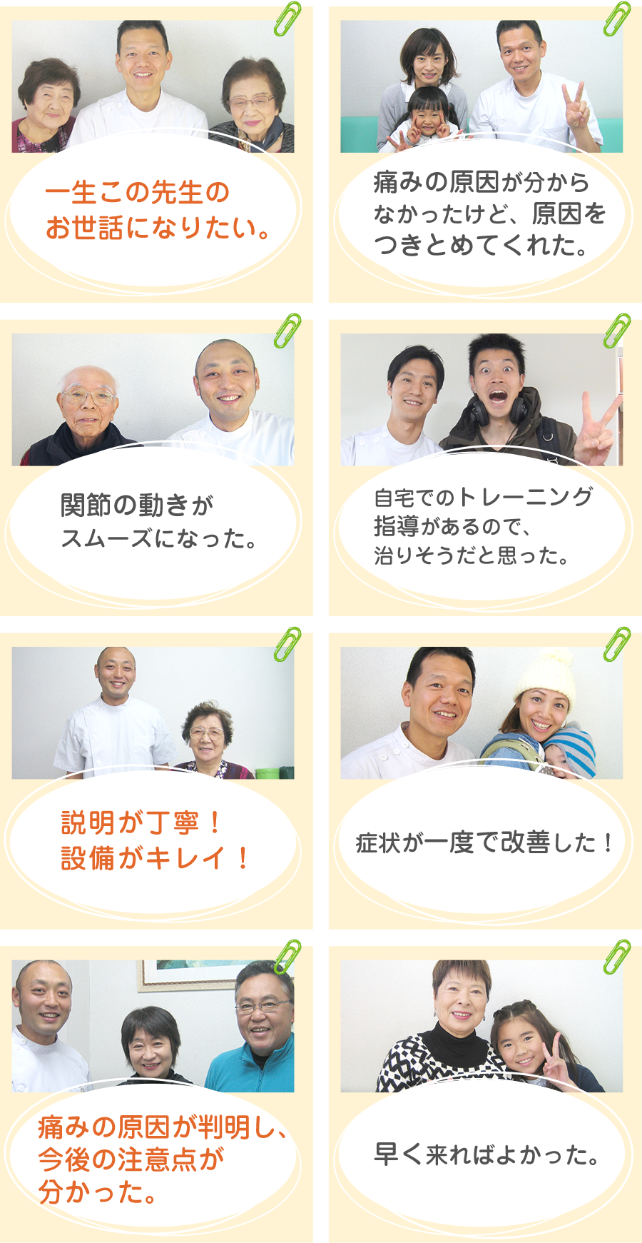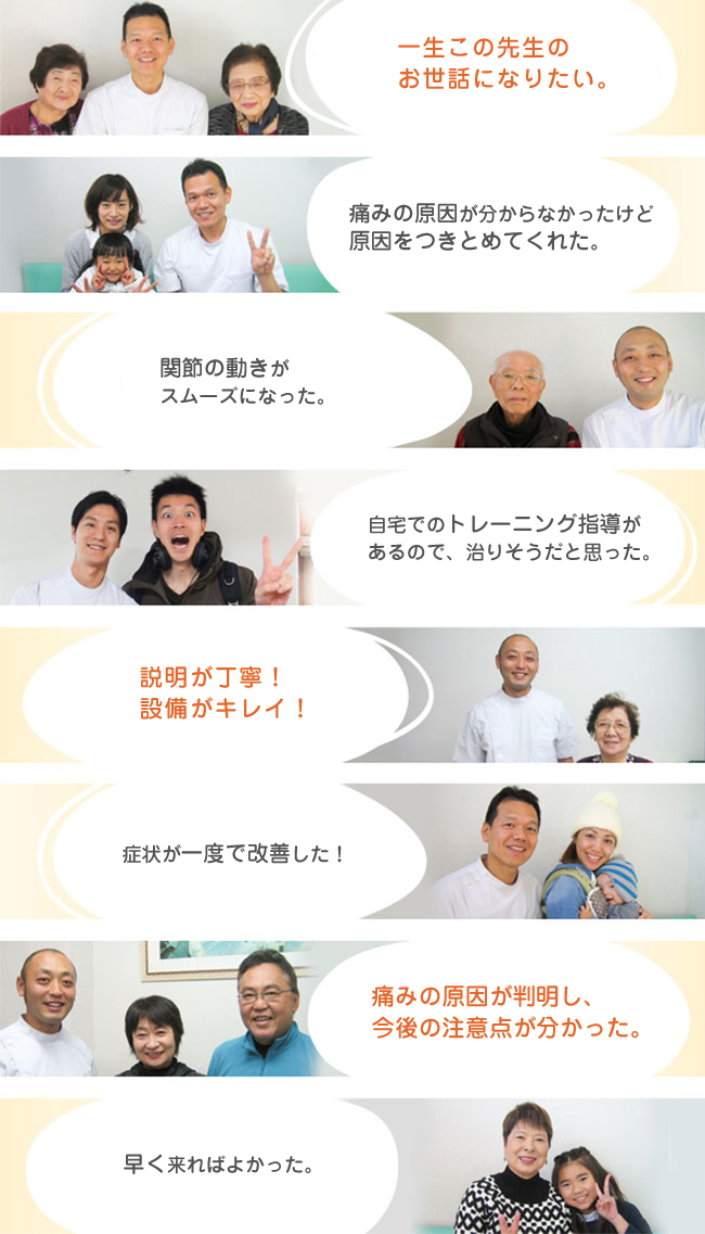 施術はもちろんのこと、ほとんどの痛みには原因がある為、それらの原因を見つけ、日常生活指導にも力を入れています。